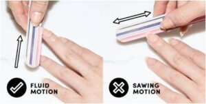 Never rush while filing the nails as it can damage the nail bed. Always file the nails in one direction slowly and gently to ensure to smooth away rough edges.